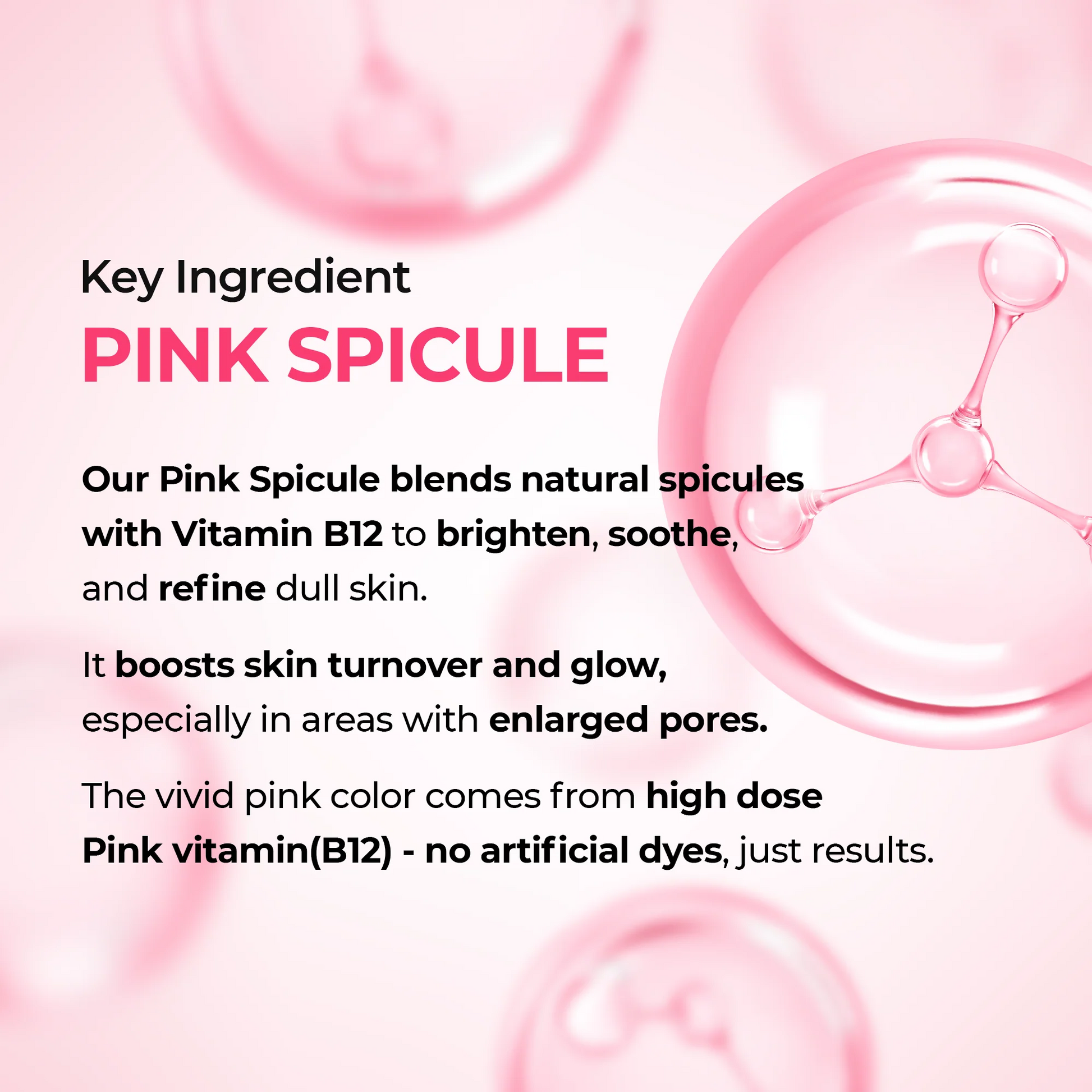 Pink Spicule blends natural spiculeswith Vitamin B12 to soothe, refresh,and support a smooth skin texture.